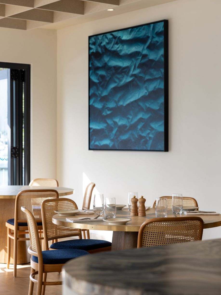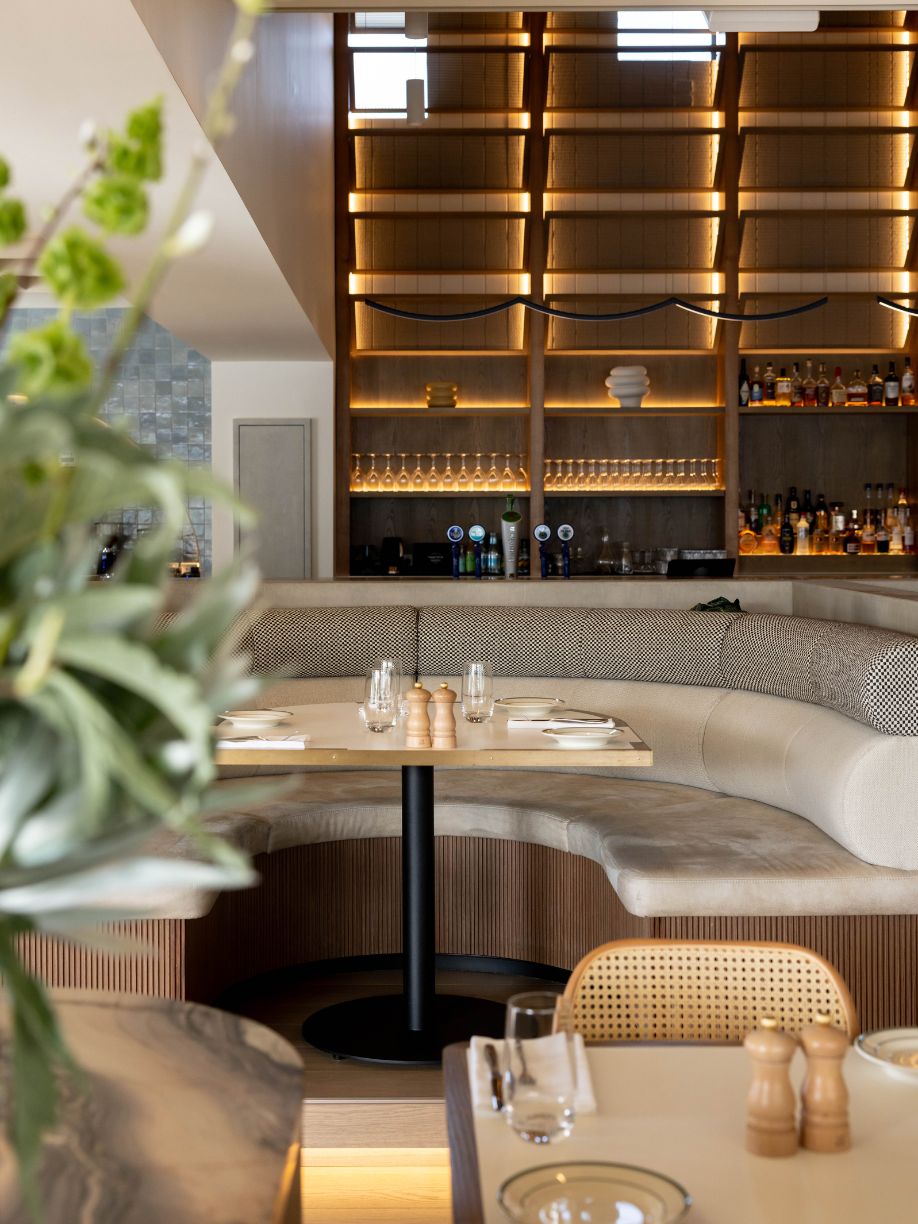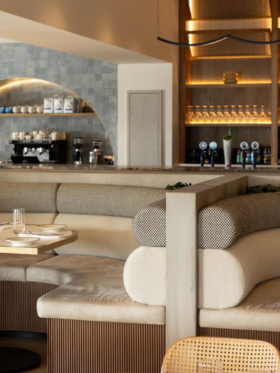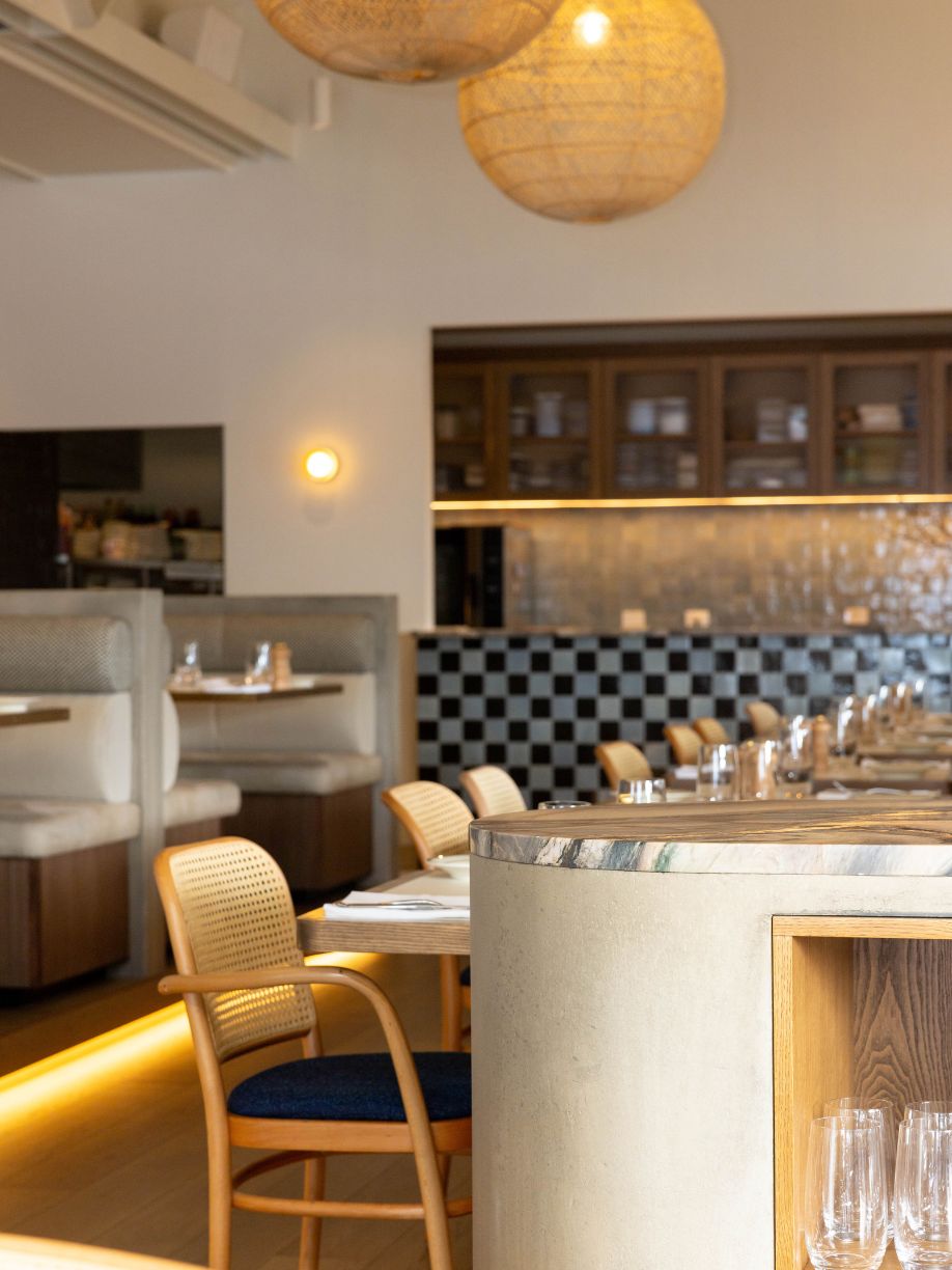 The design incorporates natural materials like French pavers, oak, marble, and colours drawn from the harbour, creating a tactile and fun atmosphere with a residential, welcoming vibe. Louvred windows bring in natural light, while varied seating arrangements encourage socialising and intimate dining experiences. A checkered-tile servery draws attention to the kitchen, inviting guests to engage with the culinary artistry on display.