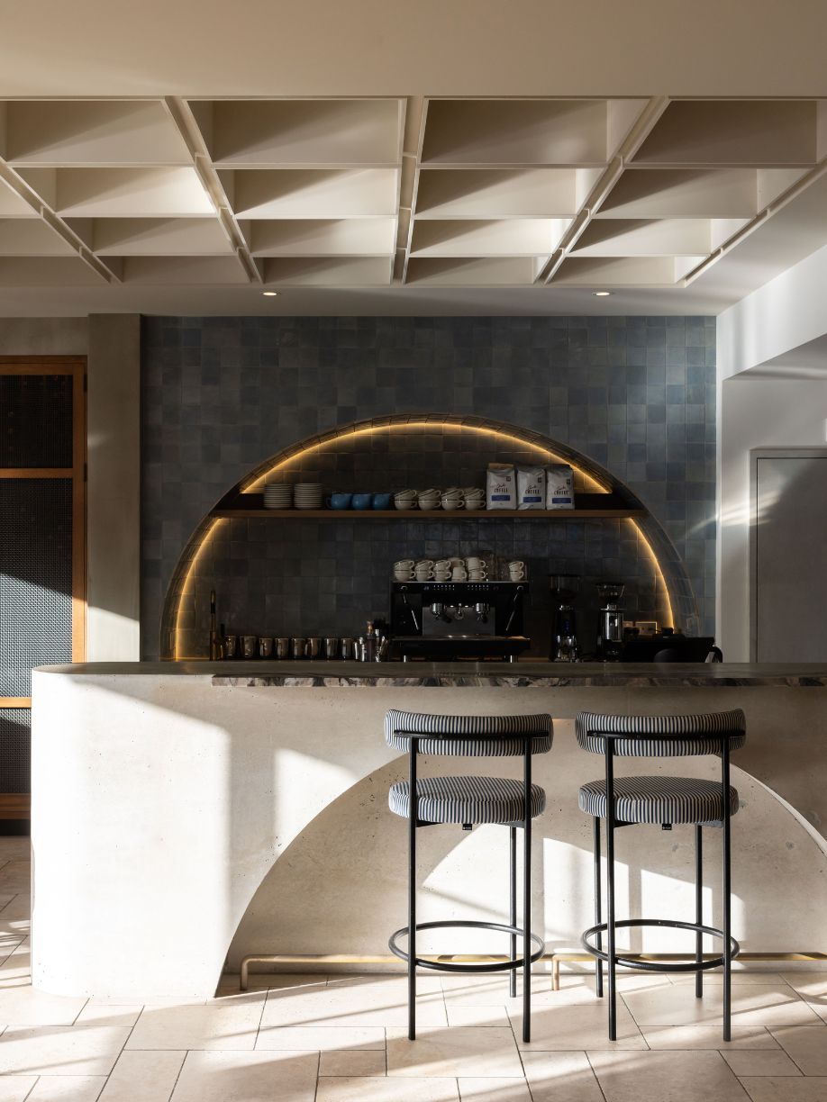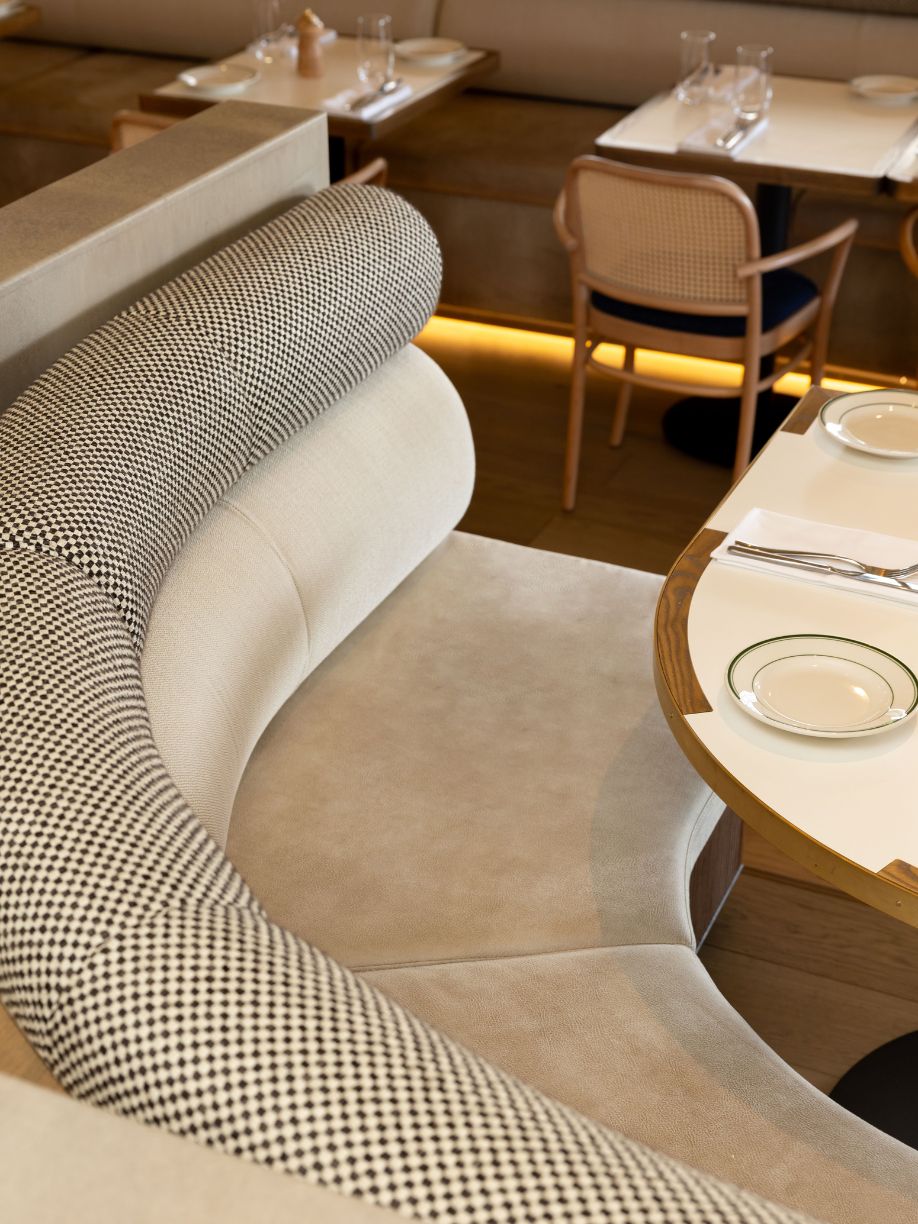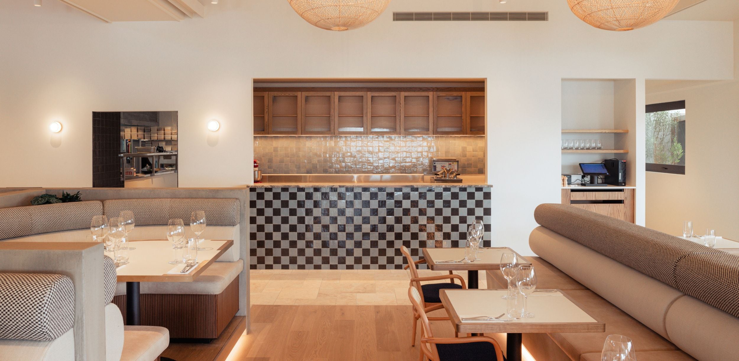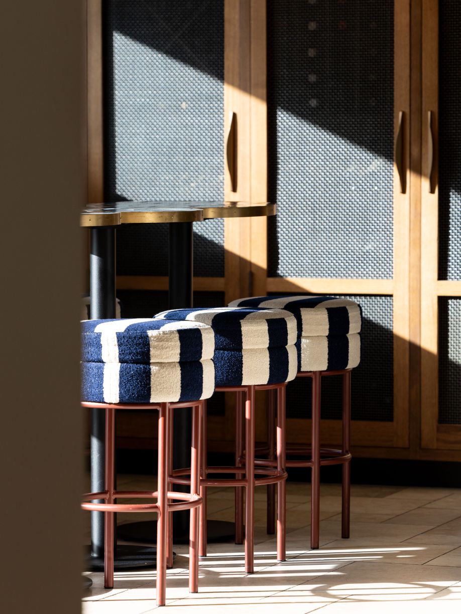 The design incorporates natural materials like French pavers, oak, marble, and colours drawn from the harbour, creating a tactile and fun atmosphere with a residential, welcoming vibe. Louvred windows bring in natural light, while varied seating arrangements encourage socialising and intimate dining experiences. A checkered-tile servery draws attention to the kitchen, inviting guests to engage with the culinary artistry on display.