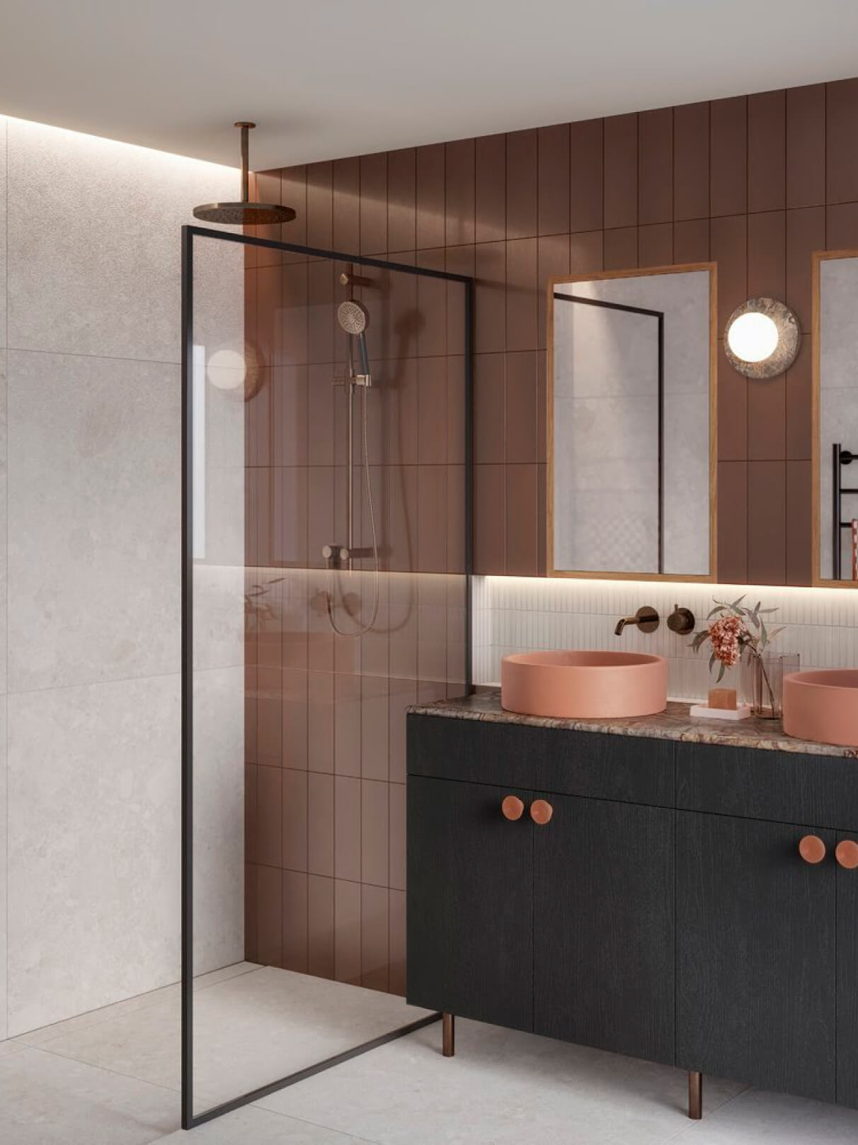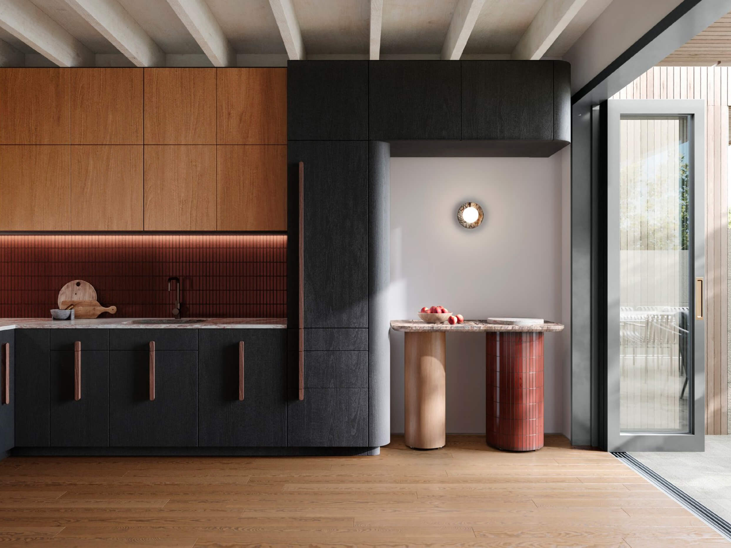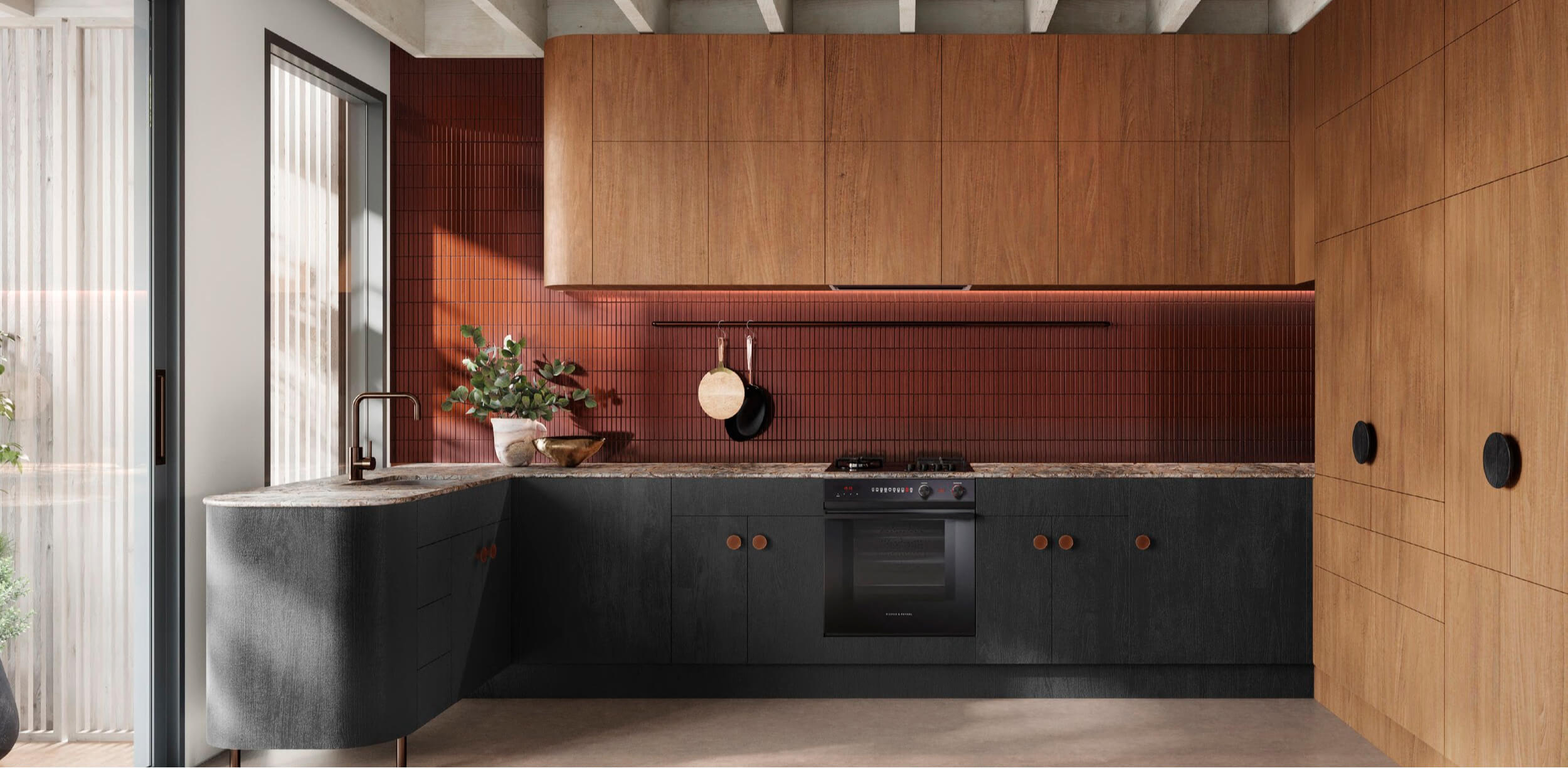 Drawing inspiration from its location, a contemporary colour scheme has been chosen that showcases the earthy hues of Kōkōwai (red ochre) and obsidian, complemented by the natural warmth of timber tones. Additional features have been designed with a neutral and minimalist touch, allowing ample natural light to flood the interiors and create an open and inviting ambience.
