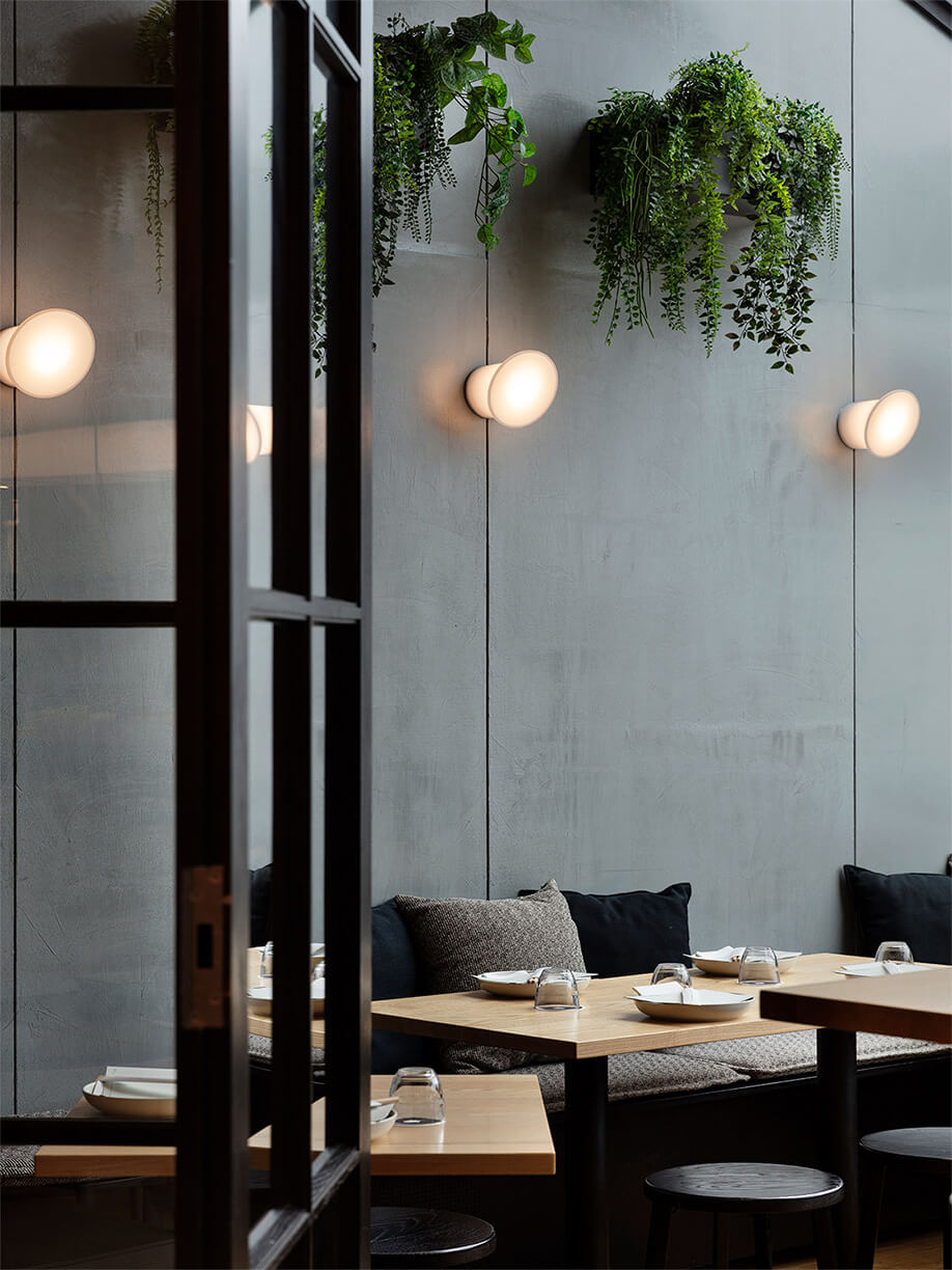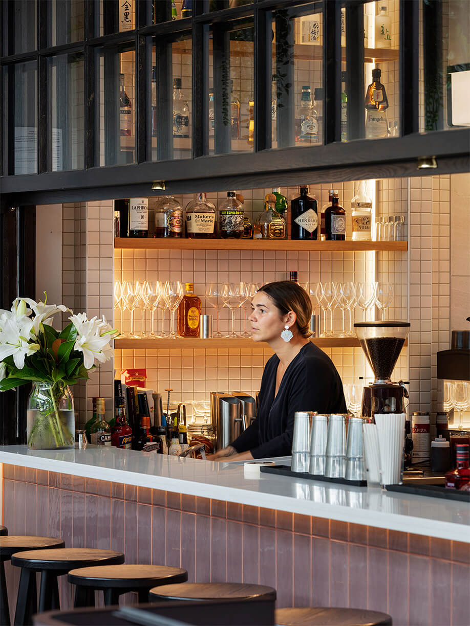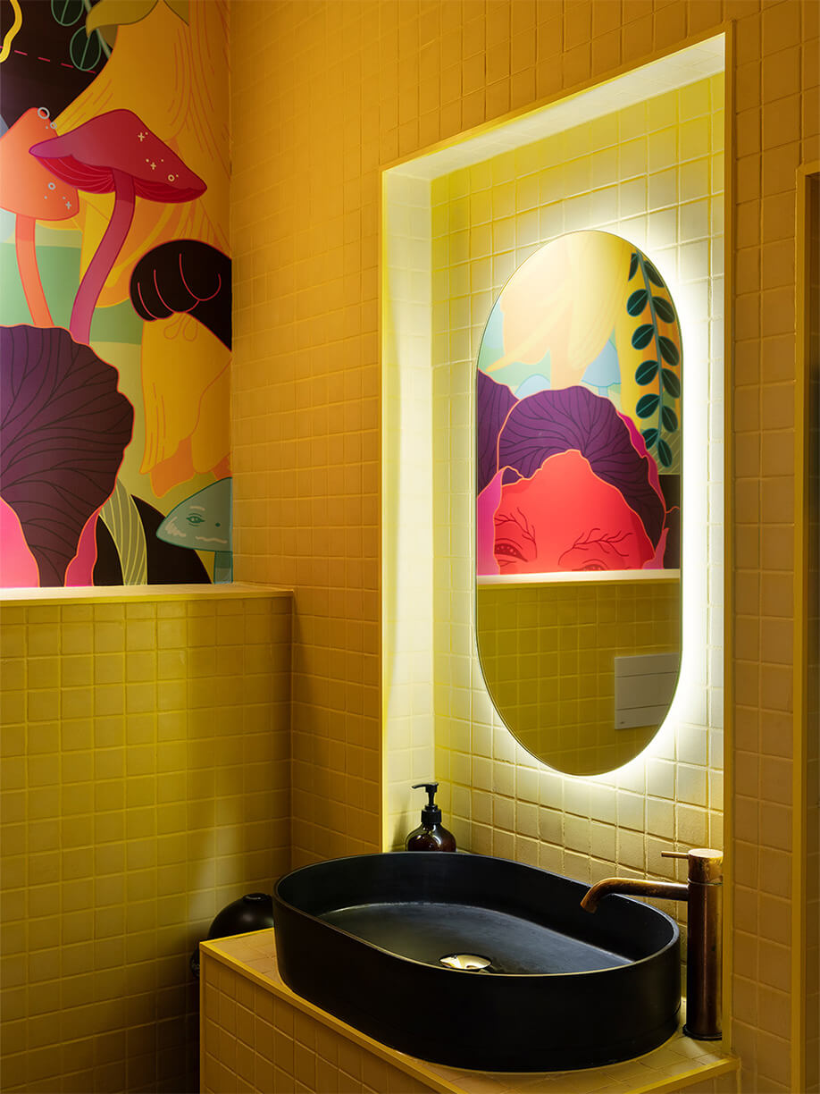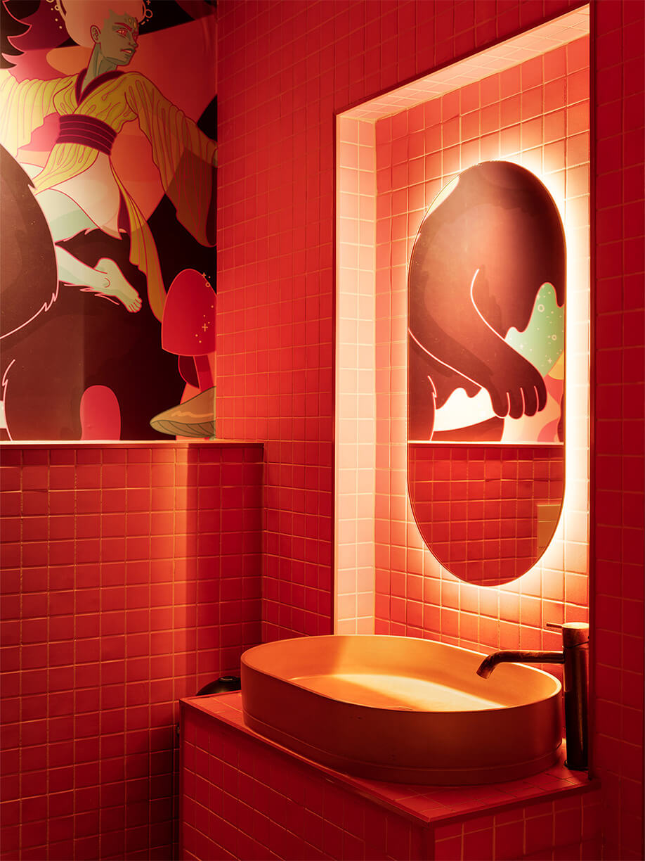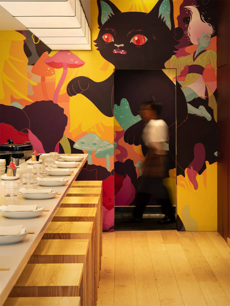 In the finishing flourishes, a vibrant personality is injected with the graphic designs playfulness and colour — highlighted with the now iconic pink neon cat, resplendent in its prominent back wall position. A long, linear, and open kitchen runs down one side of the restaurant, providing diners with interaction and drama. The space features different seating typographies making it perfect for all manner of dining experiences. Unexpected moments of playfulness are discovered in the bathrooms, with colour taking centre stage, from the graphic walls through to the tiles. The result is a beautifully curated space that opened to rave reviews for both the food and interior and has upheld that high standard ever since.
