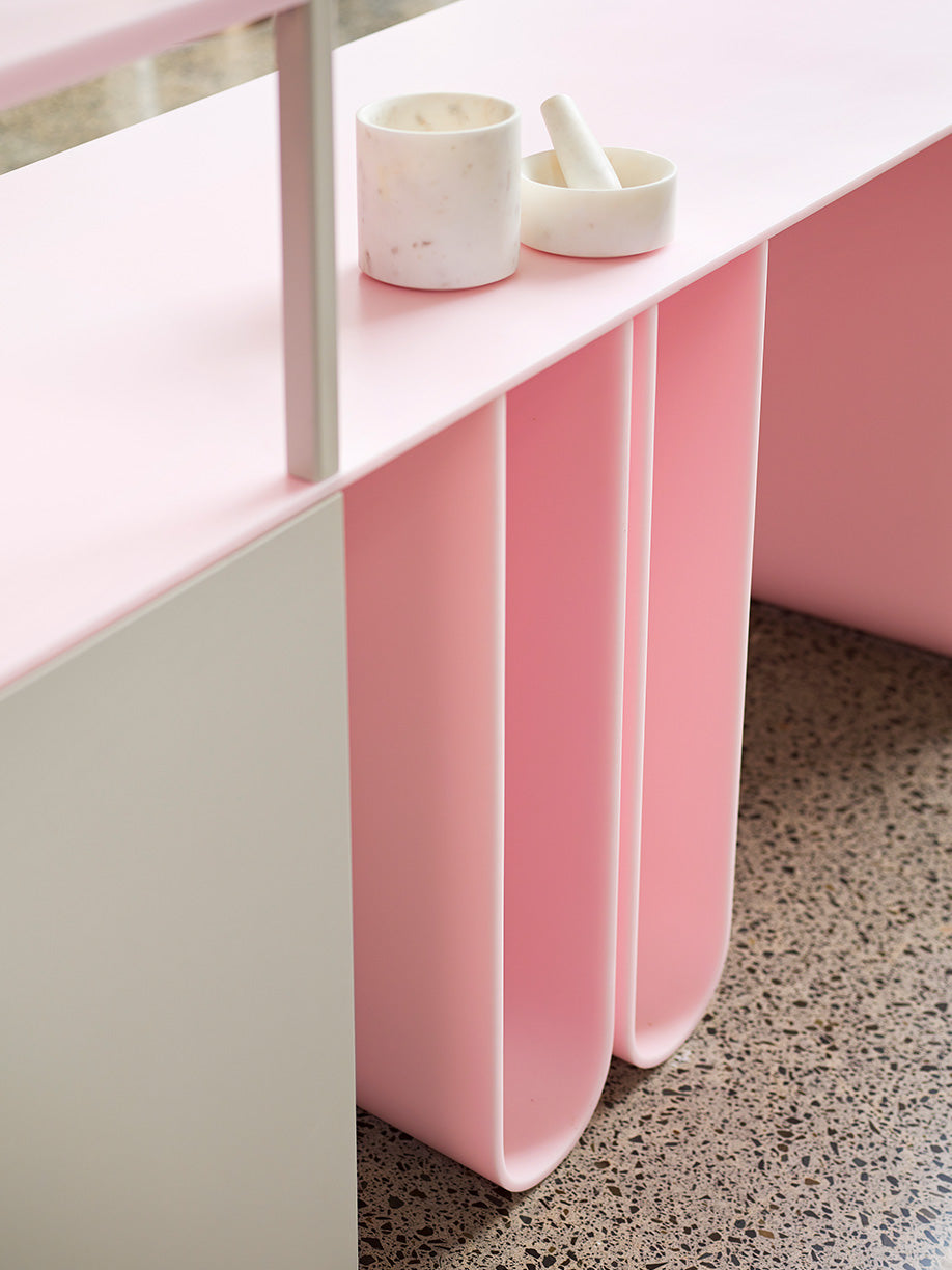 Through the considered design philosophies and colour psychology, the Laminex showroom evokes a range of emotions and utilises and celebrates the product on display, confidently demonstrating a variety of products in context and using unexpected material applications to create a tactile and inviting space.