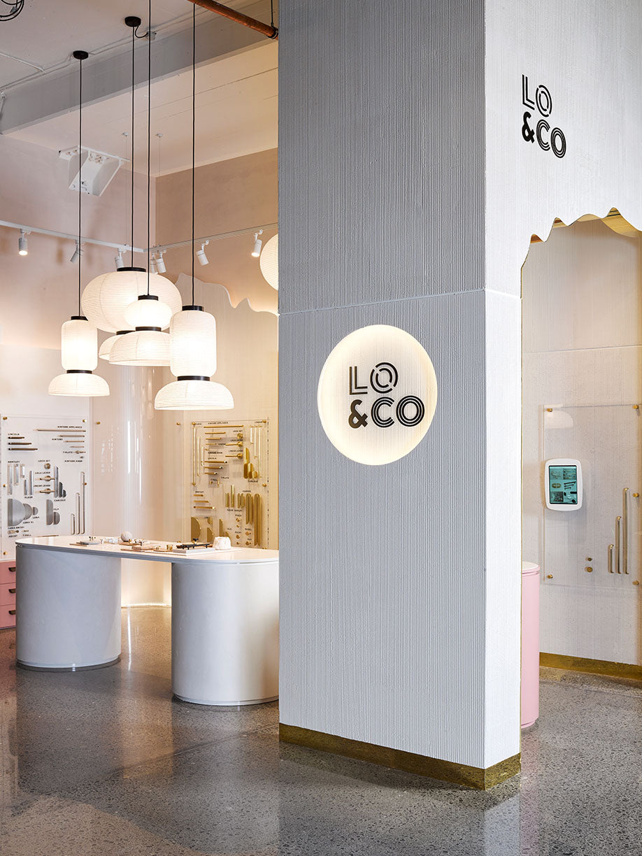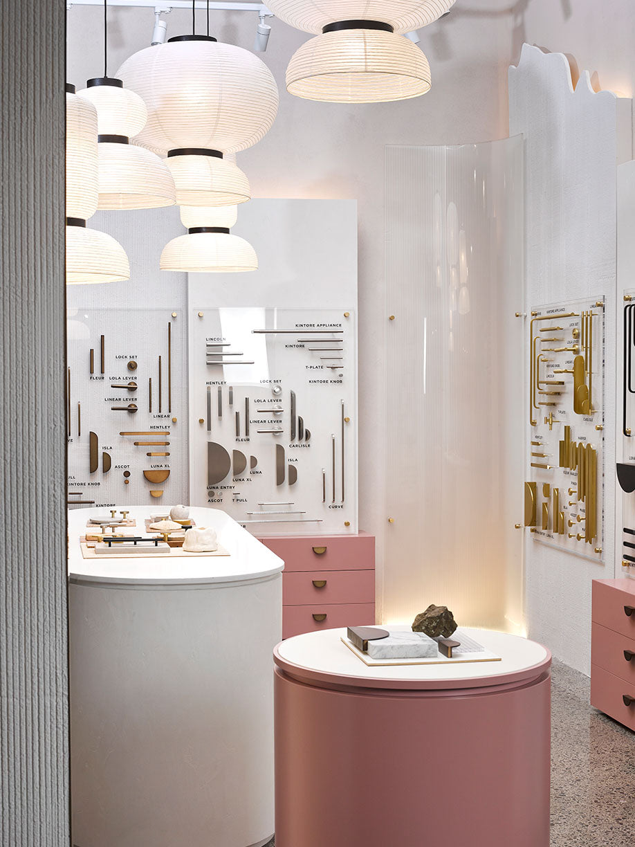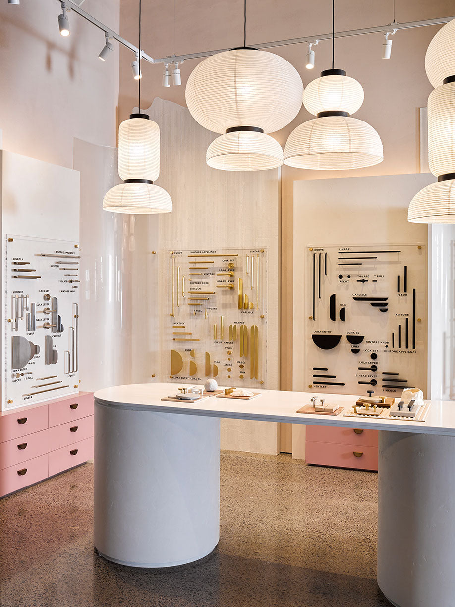 In opening its first New Zealand retail space, high-end architectural hardware company Lo & Co wanted its showroom to make a statement. Occupying a 25 sqm corner site within the Home Ideas Centre, the opportunity was in crafting an immersive space that artfully demonstrates the design applications of its modern hardware pieces. The design concept for the showroom centres around the idea of hardware as the "crowning jewel to beautiful cabinetry," with a focus on fashion-led design. Drawing inspiration from jewellery stores, the displays are delicate and carefully curated to highlight the beauty and craftsmanship of Lo & Co's products. At the heart of the showroom are two central plinths, which feature a mix of materials such as stone and glass. This allows customers to explore the range of product options and visualise how the hardware will look within their own spaces. The layout is thoughtfully designed to create an inviting and interactive experience for visitors. A cluster of illuminated paper pendants hanging overhead adds to the overall ambiance — a shining beacon to designers and inspiration-seekers as they journey through the building.
