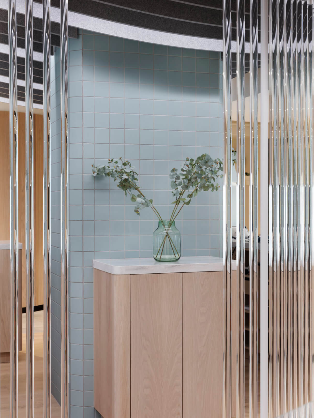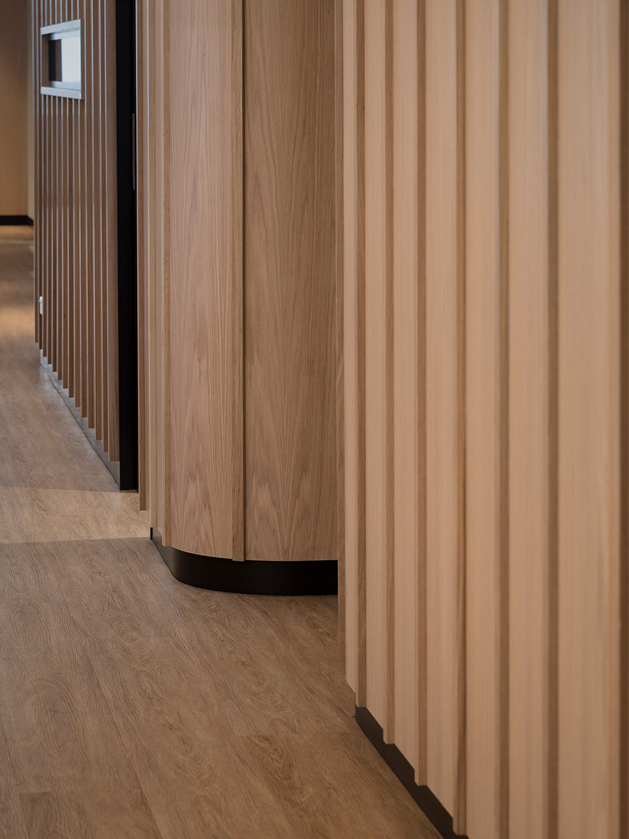 Influenced by Japanese design principles, the use of a neutral palette and repeated timber slats challenges the sterile and impersonal image typically associated with dental practices, creating a comfortable and humanistic experience. A thoughtful layout creates clear paths through the space, creating a seamless and natural transition between reception, private consulting rooms and the surgeries. Hints of green add to the tranquillity of the overall space, a calming spirit that is mirrored through backlit wall pendants and feature lighting that creates a warm comforting glow.