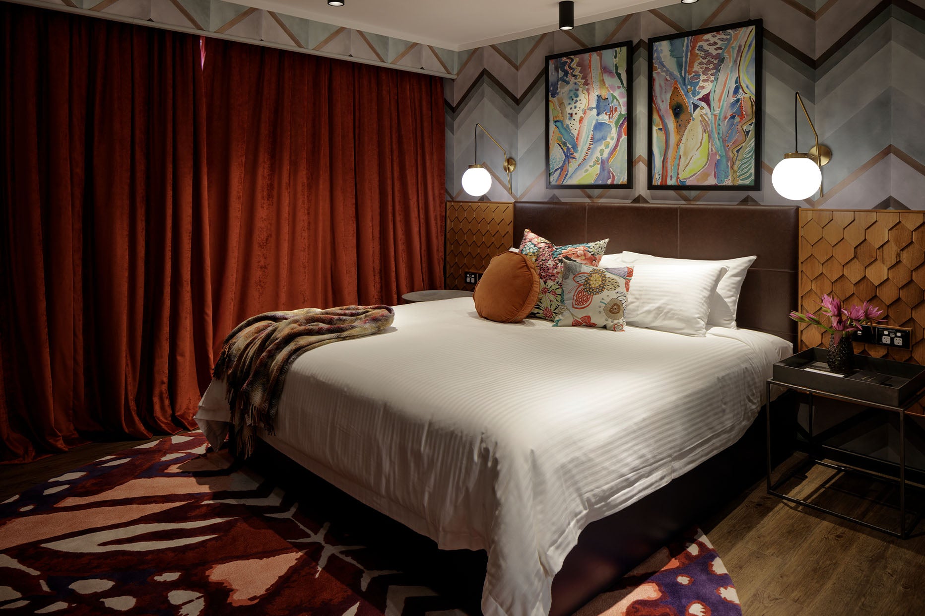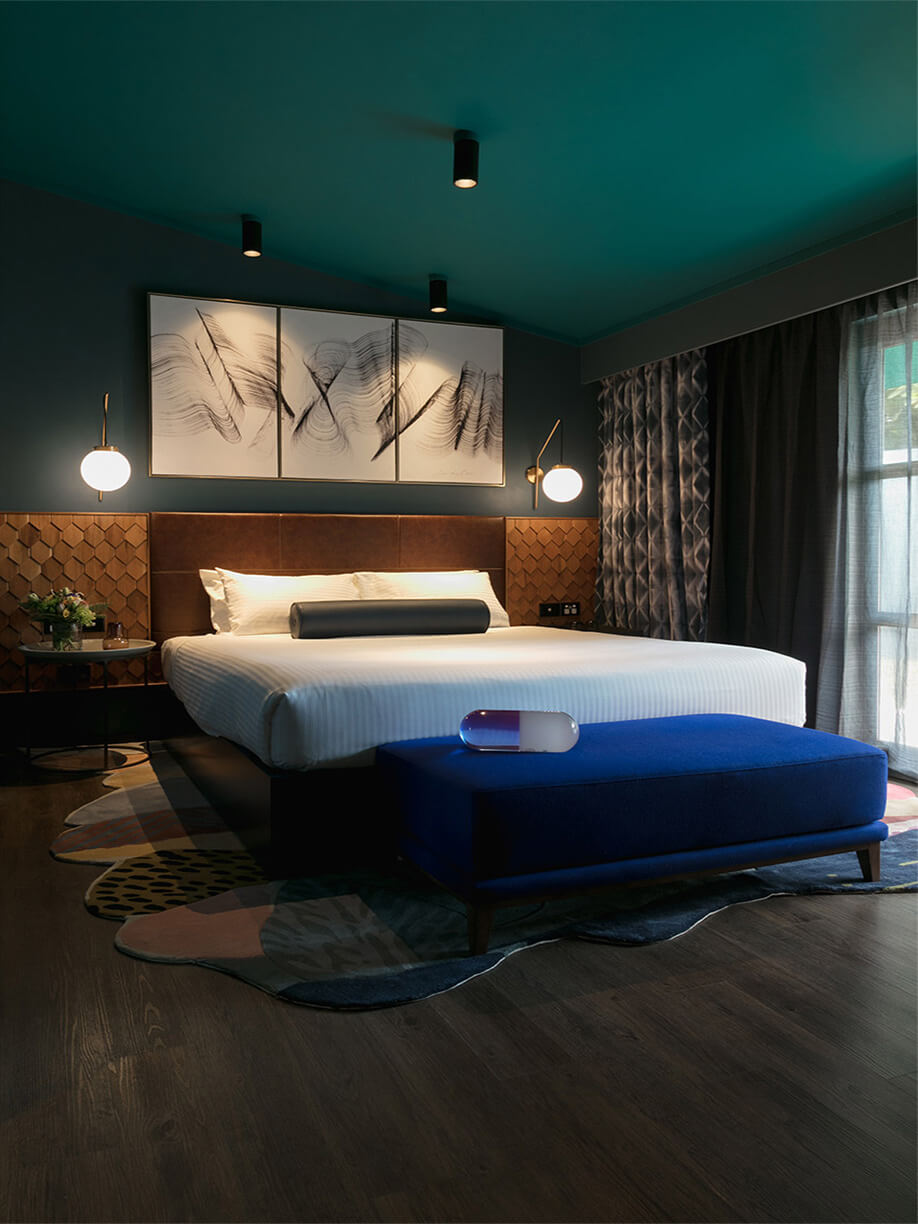 The renovation included a complete reimagination of reception, bar, lounges, and restaurant areas through to the bedrooms — which find a delicate balance between ‘at home’ comfort and ‘out-of-this-world’ wonder. Dialling up the drama are two icon-inspired suites: the eclectic Ziggy Suite, takes inspiration from fashion icon Missoni and signature bright colours and prints; and the riotous Dottie Suite, referencing Japanese artist Yayoi Kusama and her synonymous polka dot artworks. With a focus on creating an environment that was both luxurious and playful, we carefully curated each space to create a unique and memorable experience that would truly set this hotel apart.